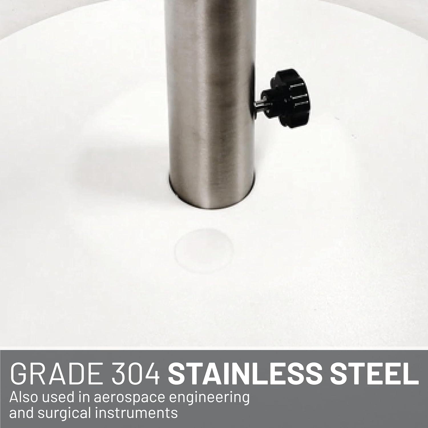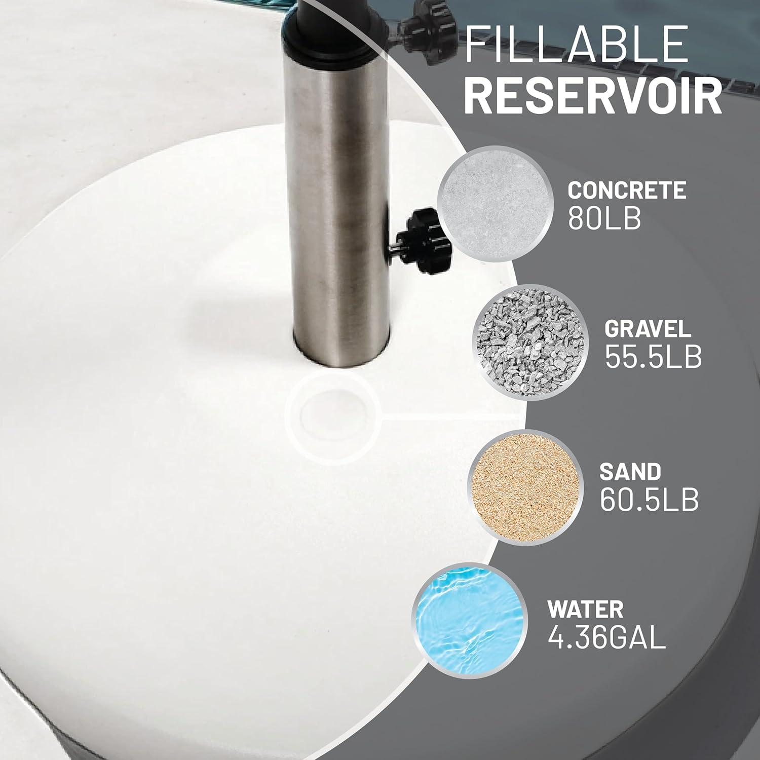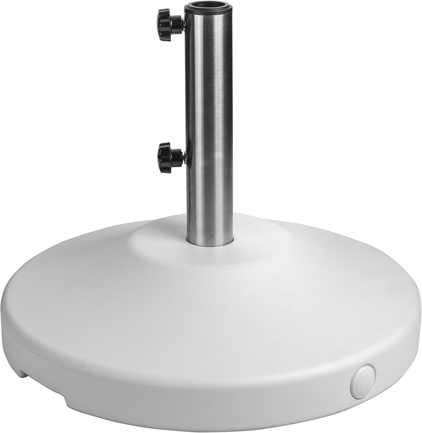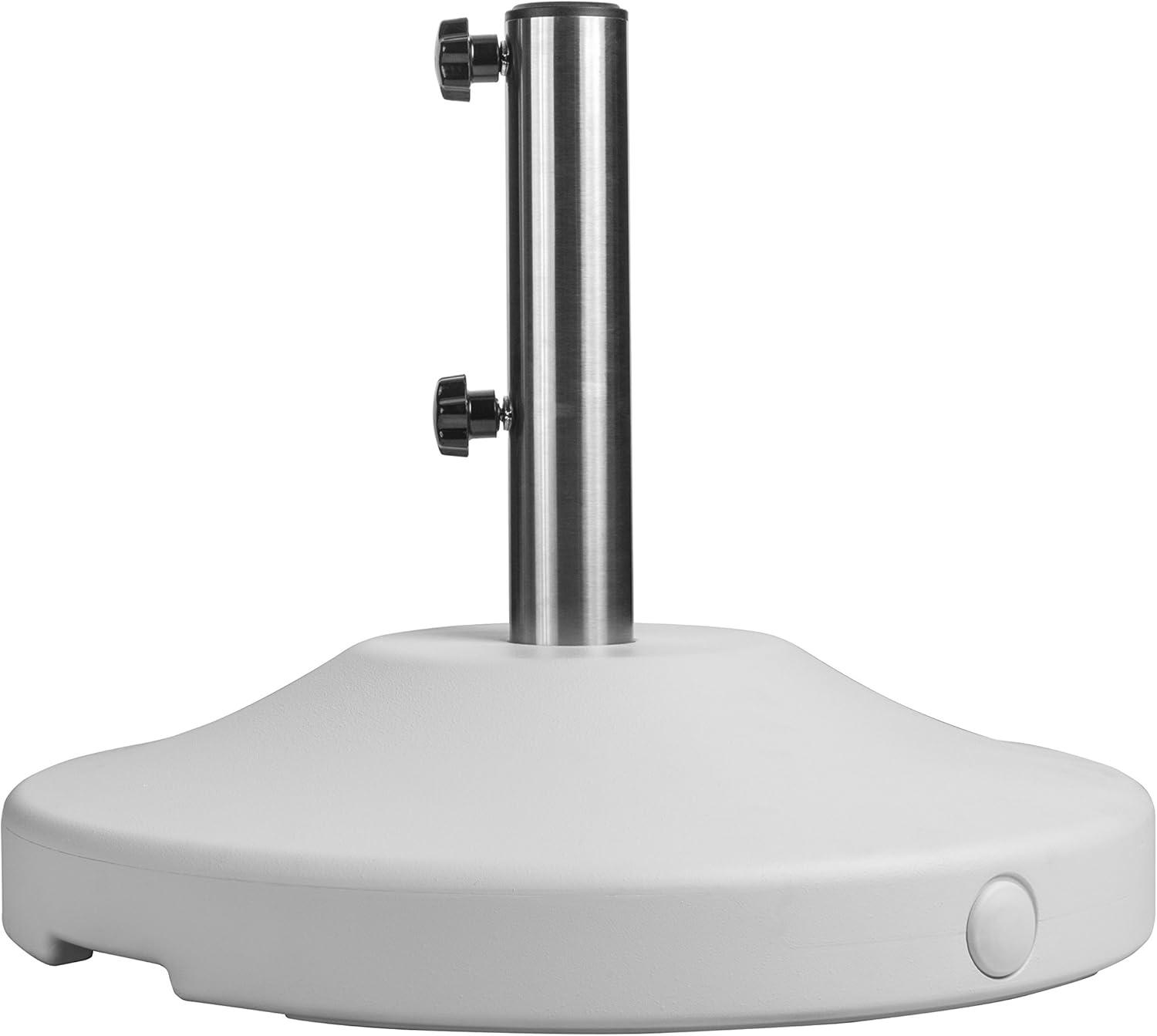 Set up this free-standing umbrella base on your patio or at any outdoor event without worry. The US Weight 80 Pound Free Standing Umbrella Base is crafted with a high-density polyethylene shell with UV protection that will not rust, dent, or fade, and can withstand the elements in any weather climate. This stable base must be filled with sand or gravel. Easily transport and setup the base with the removable wheel on bottom and hand grips for easier mobility. The 20.5″ diameter base features a 14″ high stem that accommodates poles from 1 ½” through 2″ thick. Inside the stem is a plastic post protector for the umbrella to rest on instead of a screw leaving the pole undamaged. The stem features two knobs made of polypropylene that tighten the umbrella securely in place for added stability and support. If used with a patio table, 14″ clearance is needed. All of the steel components are made of grade 304 stainless steel. Grade 304 stainless steel is also used in aerospace engineering and surgical instruments and will not rust. The umbrella bases come in four colors – black, bronze, grey and white – and prefilled or empty options.