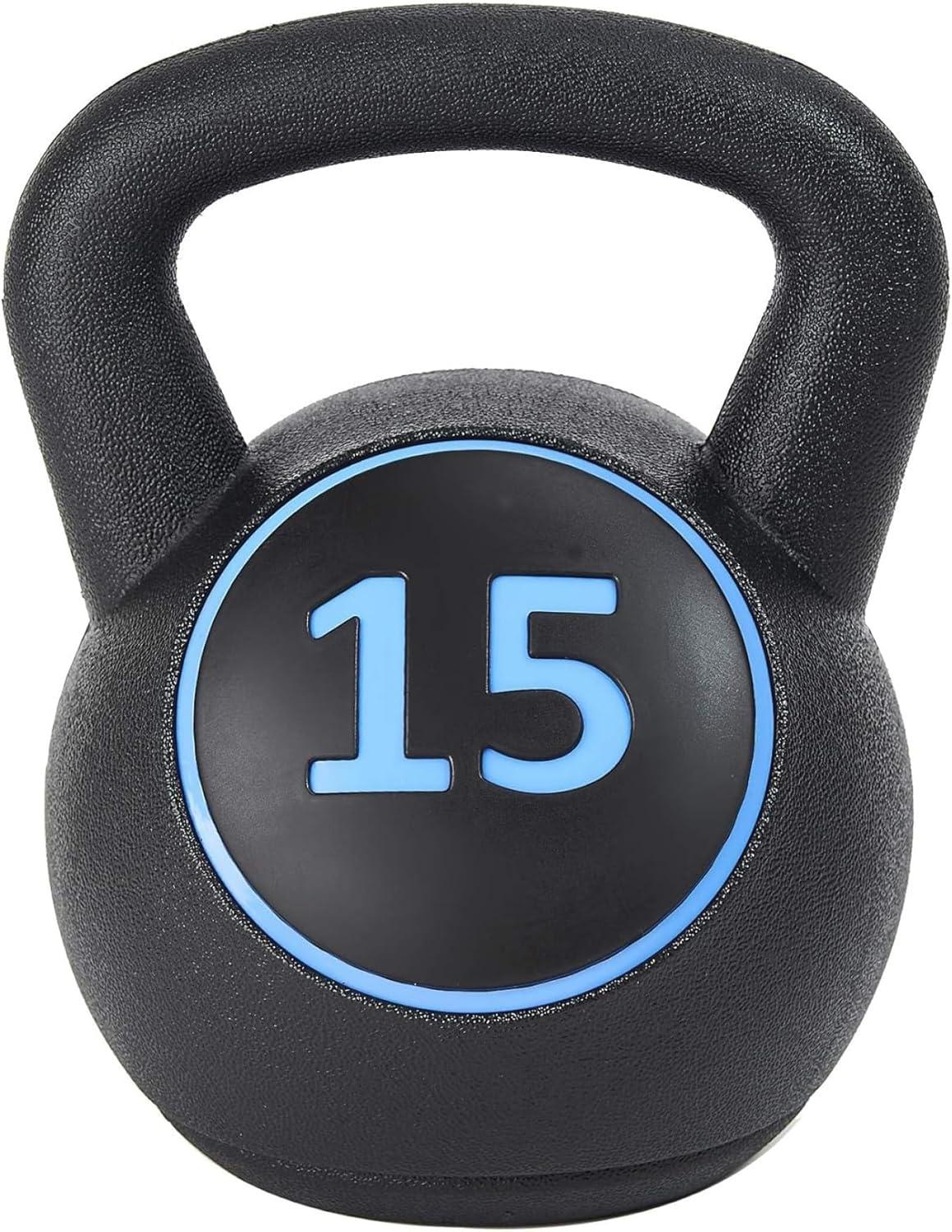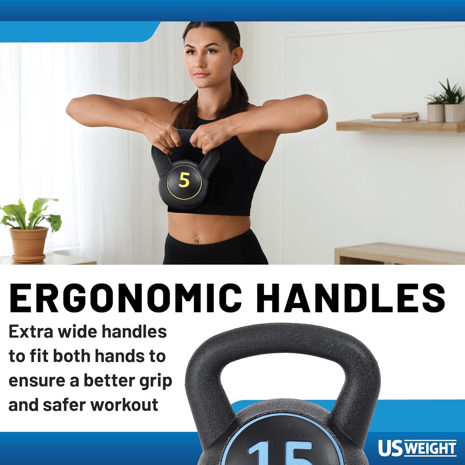 This plastic kettlebell set includes 5lb, 10lb and 15lb kettlebells to allow a wide variety of exercises and progression. These kettlebells feature a cement core covered with a durable, high-strength HDPE shell. The wide grip handles and textured surface provide secure handling during swings, presses, snatches, and other dynamic moves. Kettlebell workouts deliver functional whole-body fitness by combining the burn of cardio with muscle building strength training and compound movements that deliver greater flexibility and coordination. Featuring the classic design popularized in Russia a few hundred years ago which allows them to be employed in countless ways—including swings, presses, rows, twists, squats and snatches, these kettlebells are weighted off-centered, which engages more stabilizer muscles and works the targeted muscles through a wider range of motion.