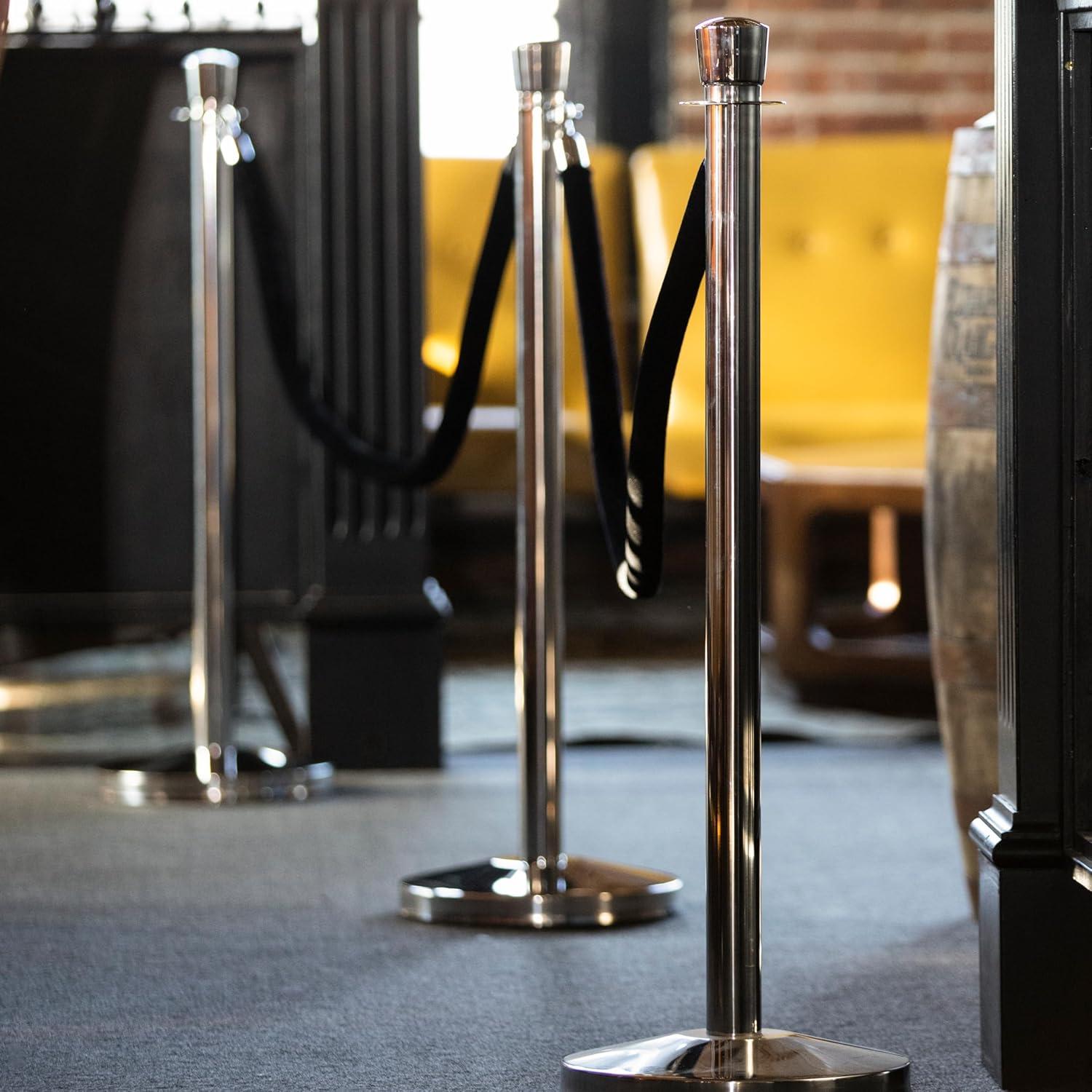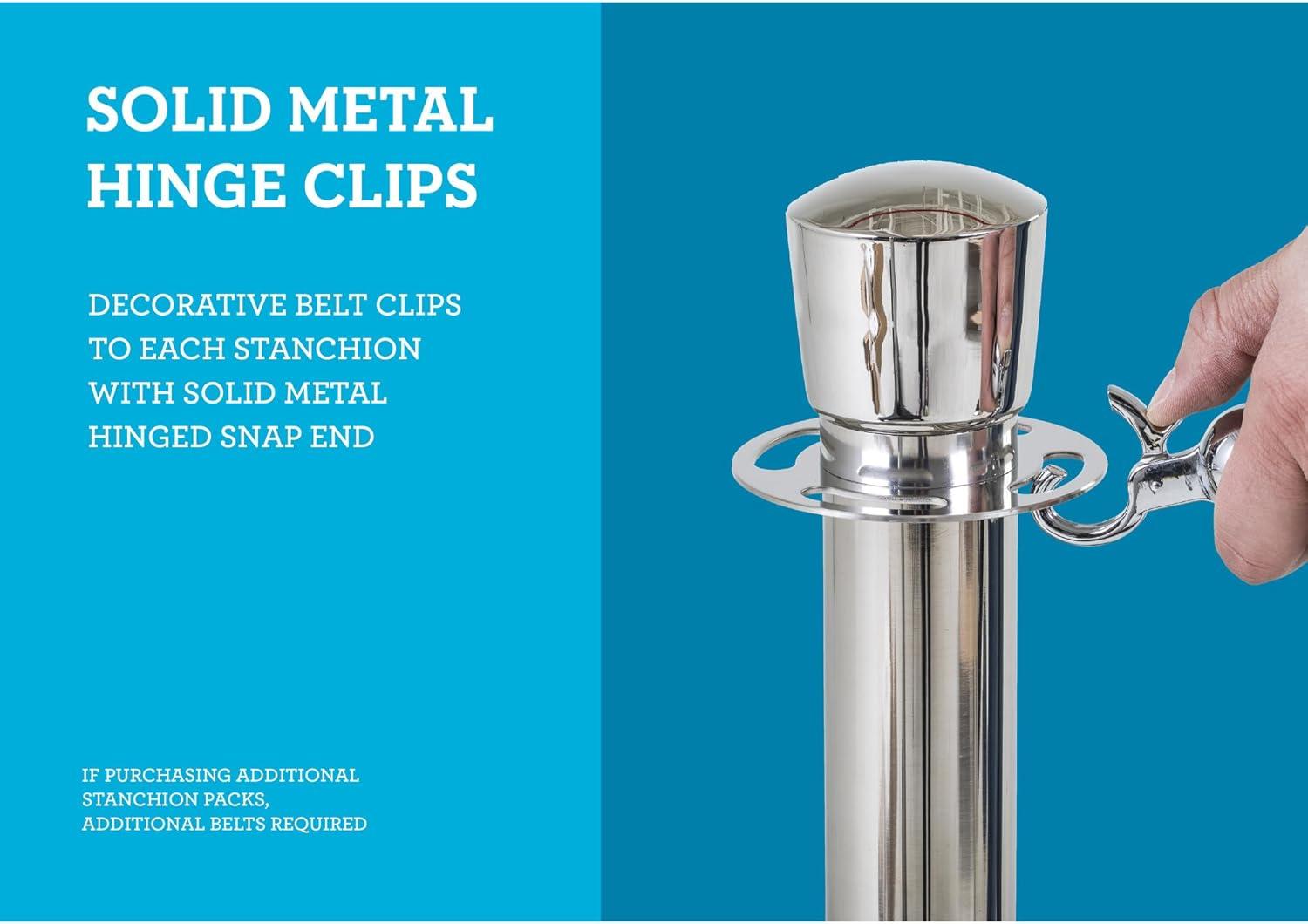 Includes two chrome stanchions and one 6’ long velvet rope with solid metal, hinged belt clips